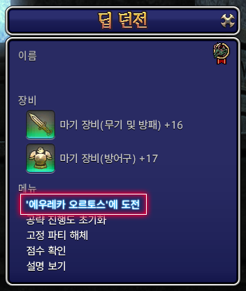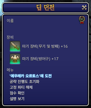 부가 퀘스트 ‘강성한 자도 끝내는 사라졌나니’새창를 완료하고 마기 장비(무기 및 방패)와 마기 장비(방어구)를 +10까지 강화한 경우, 모르도나(X:34.9 Y:19.0)에 있는 NPC ‘창출 시스템’새창을 통해 마기 장비 교환용 아이템인 ‘오르토스 마기 손잡이’를 얻을 수 있습니다. ‘오르토스 마기 손잡이’를 교환할 때에는 딥 던전에서의 마기 장비(무기 및 방패)와 마기 장비(방어구)의 강화 단계가 10 감소합니다.