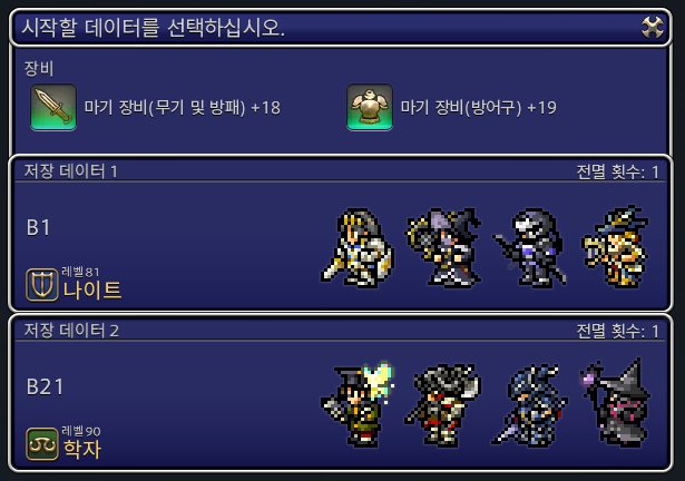 고정 파티로 다시 도전할 경우, 파티원 전원이 동일한 저장 데이터를 지니고 있어야 합니다. 또한 이 저장 데이터에 기록된 파티원과 클래스/잡 등 현재의 파티원들의 구성이 저장하기 전과 동일해야 이어서 진행할 수 있습니다. |