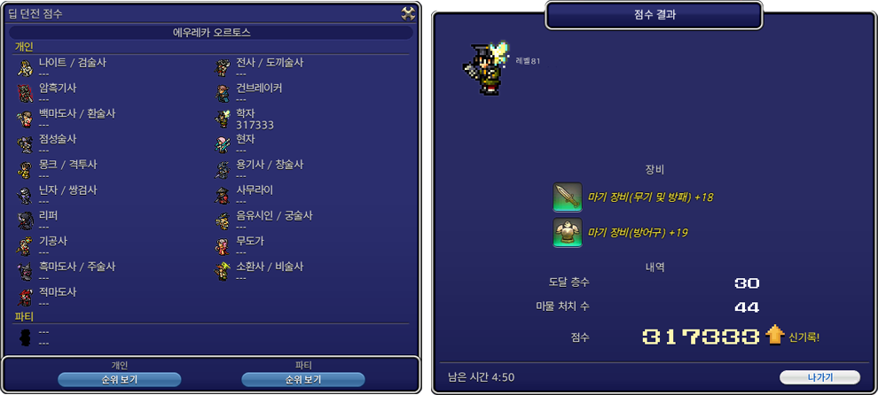 점수는 전멸하거나 특정 층을 완료할 경우에 산출되며, ‘고정 파티’로 각 직업을 혼자서 공략한 경우와 파티로 공략했을 경우의 각각 가장 높은 점수가 신기록으로 저장됩니다. 저장된 신기록은 모르도나(X:34.8 Y:19.2)에 있는 NPC ‘카툰’과 대화할 때 표시되며 딥 던전 전용 메뉴에서 확인할 수 있습니다. ※ 점수 정보는 고향 서버에서 플레이하는 경우에만 갱신됩니다. ‘서버 텔레포’를 이용하여 고향 서버가 아닌 곳에서 플레이하는 경우에는 갱신되지 않습니다.
