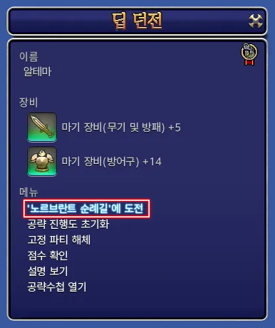 임무 찾기와 동일하게 전 서버 플레이어를 대상으로 매칭을 진행하여 노르브란트 순례길에 도전합니다. 반드시 4인으로 입장하기 때문에 1인 또는 4인 미만의 파티로 참가 신청을 할 경우 부족한 파티원이 매칭됩니다. 딥 던전에서는 매칭 파티로 공략하는 도중에 파티원이 부족하게 되면 ‘파티원 보충’을 이용할 수 있지만, T91 이후에는 이용할 수 없습니다.
