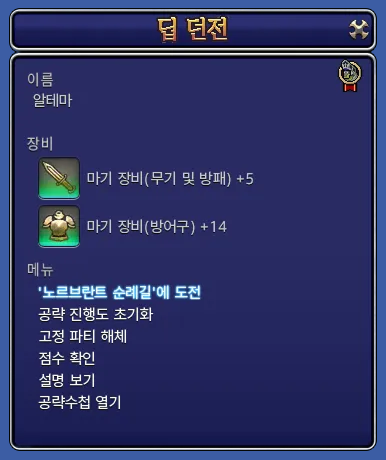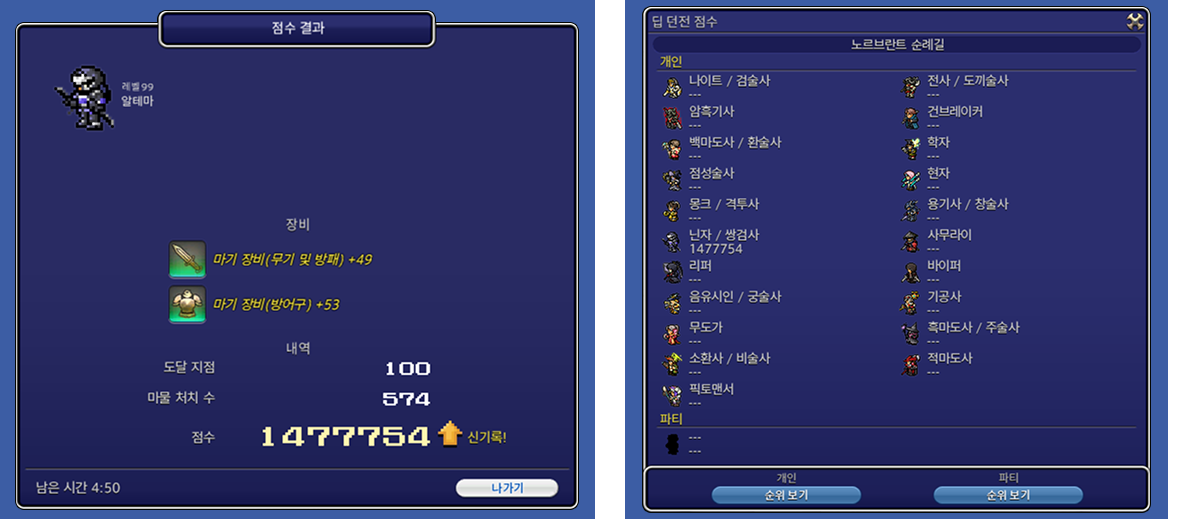 점수는 전멸하거나 특정 층을 완료할 경우에 산출되며, ‘고정 파티’로 각 직업을 혼자서 공략한 경우와 파티로 공략했을 경우의 각각 가장 높은 점수가 신기록으로 저장됩니다. 저장된 신기록은 일 메그(X:29.9 Y:6.0)에 있는 NPC ‘반사우’와 대화할 때 표시되는 딥 던전 전용 메뉴에서 확인할 수 있습니다. ※ 점수 정보는 고향 서버에서 플레이하는 경우에만 갱신됩니다. ‘서버 텔레포’를 이용하여 고향 서버가 아닌 곳에서 플레이하는 경우에는 갱신되지 않습니다.