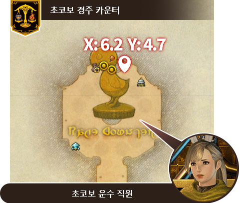 초코보 광장 초코보 경주 카운터(X:6.0 Y:4.7)에 있는 NPC '초코보 조련사'에게 말을 걸어 경주 초코보 등록을 합니다.